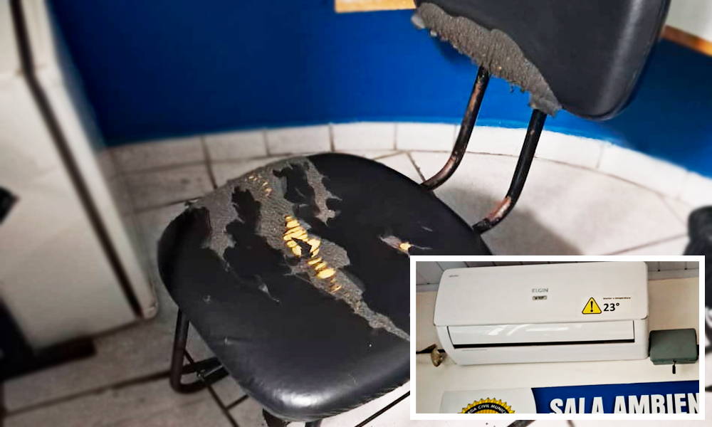 Conforme estão registrados nas fotos, o local para trabalho de nossos guerreiros e guerreiras da segurança está insalubre. Piso com defeito, cadeiras aos pedaços. E o ar-condicional travado com cadeado… onde já se viu algo desta natureza?! Uma aberração!!!