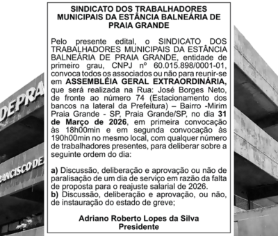 SINDICATO DOS TRABALHADORES MUNICIPAIS DA ESTÂNCIA BALNEÁRIA DE PRAIA GRANDE ASSEMBLEIA GERAL EXTRAORDINÁRIA EDITAL DE CONVOCAÇÃO Pelo presente