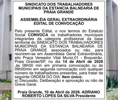 Leia maisEDITAL DE CONVOCAÇÃO Pelo presente Edital, o SINDICATO DOS TRABALHADORES MUNICIPAIS DA ESTANCIA BALNEARIA DE PRAIA GRANDE, na forma dos artigos 40 e