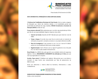 O Sindicato dos Trabalhadores Municipais de Praia Grande informa a toda a categoria da Educação que, diante das inúmeras dúvidas e da instabilidade gerada pela proximidade da atribuição de carga ampliada, OFICIOU formalmente a Secretaria de Educação (SEDUC) na data de hoje.